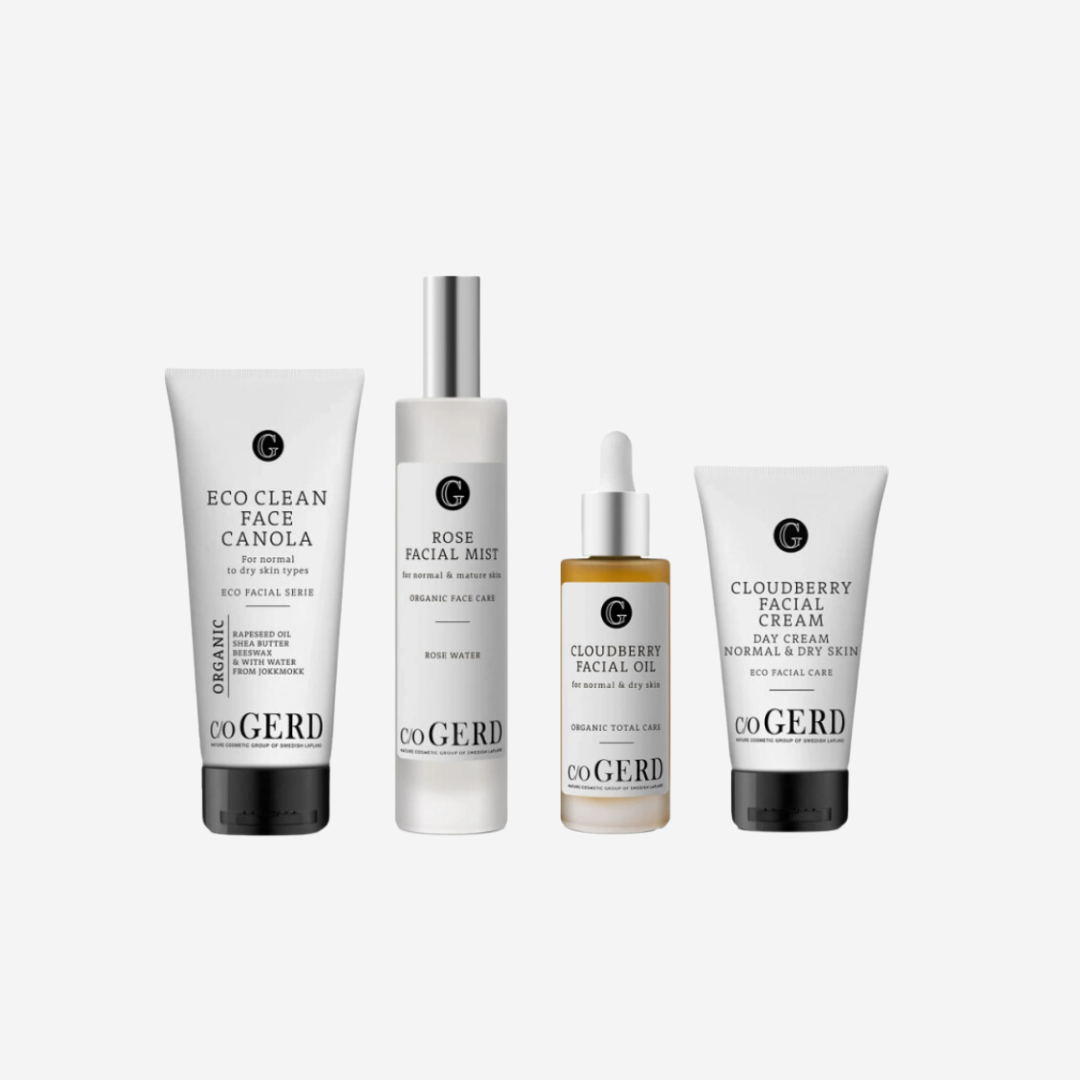 Eco Clean Face Canola: Aqua, Brassica Napus Seed Oil (rapsolja), Ricinus Communis Seed Oil (ricinolja), Potassium Olivoyl Hydrolyzed Wheat Protein (från vete), Glycerin (från raps), Butyrospermum Parkii Butter (sheasmör),Cetyl Alcohol (från kokos), Sodium Levulinate (från risstärkelse), Sodium Anisate (från basilika), Cera Alba (bivax), Glyceryl Caprylate (från solros), Xanthan Gum (från socker), Lactic Acid (mjölksyra), Cupressus Sempervirens Oil (cypress), Mentha Piperita Oil (pepparmynta), Limonene*, Citral*, Linalool*, Geraniol*, (*naturlig ingrediens i eterisk olja). Rose Facial Mist: Rosa damascena water, Sodium levulinate sodium anisate, Glycerin, Lactic acid. Cloudberry Facial Oil: Simmondsia Chinensis Seed Oil (Jojobaojla), Helianthus Annuus Seed Oil (Solrosolja), Borago Officinalis Seed Oil (Gurkörtsolja), Rosa Canina Fruit Oil (Nyponrosfröolja), Rosmarinus Officinalis Flower Extract (rosmarinantioxidant), Citrus Reticulata Extract (mandarin), Lavandula Angustifolia Oil (lavendel), Rubus Chamaemorus Seed Oil (Hjortronfröolja), Citrus Aurantium Peel Oil Expressed (Neroli), Limonene*, Citral*, Linalool*, Geraniol*, (*naturlig ingrediens i eterisk olja). Cloudberry Facial Cream: Aqua, Helianthus Annuus Seed Oil (Solrosolja), Persea Gratissima Oil (Avokadoolja), Potassium Olivoyl Hydrolyzed Wheat Protein (Från vete), Borago Officinalis Seed Oil (Gurkörtsolja), Glycerin (Från raps), Cetearyl Alcohol (Från kokos), Rosa Rubiginosa Seed Oil (Nyponrosfröolja), Rubus Chamaemorus Seed Oil (Hjortronfröolja), Tocopherol (E-vitamin), Butyrospermum Parkii Butter (Sheasmör), Glyceryl Caprylate (Från Solros), Xantan Gum (Från socker), Sodium Levulinate (Från rissträkelse), Sodium Anisate (Från basilika), Lactic Acid (Mjölksyra), Citrus Nobilis Peel Oil (Mandarinolja), Citrus Aurantium Amara Flower Oil (Neroli), Daucus Carota Sativa Seed Oil (Morotsfröolja), Sodium Ascorbyl Phosphate (C-vitamin), Linalool*, Geraniol*, Benzyl Benzoate*, Limonene*, Citral*. (*naturlig ingrediens i eterisk olja)