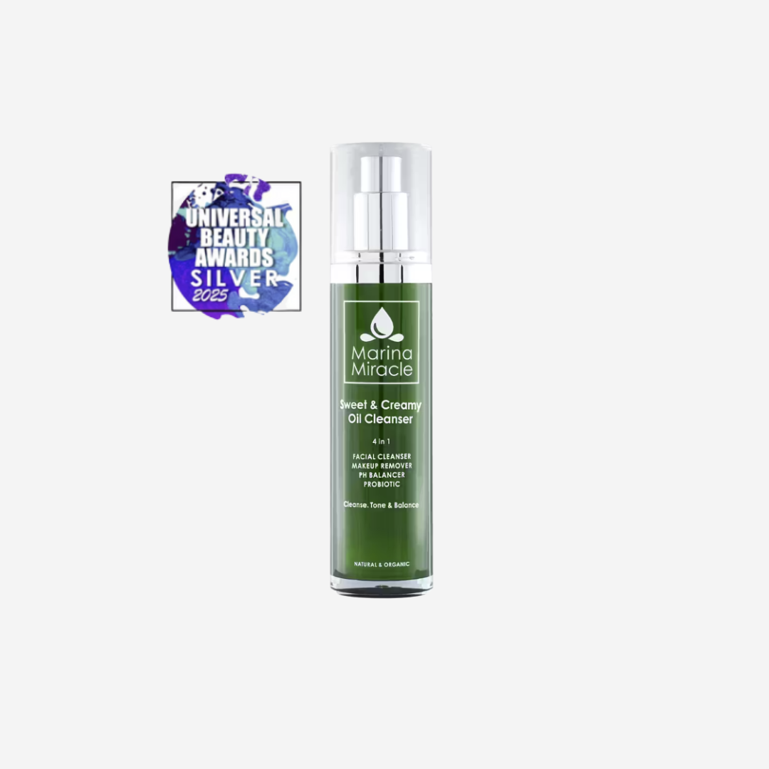 Marina Miracle Sweet & Creamy Oil Cleanser med levande probiotika är en multifunktionell oljerengöring som förvandlas till en krämig konsistens vid kontakt med vatten. Den avlägsnar all makeup (även vattenfast ögon-makeup) och rengör huden på djupet. Innehåller probiotika från 12 olika stammar.